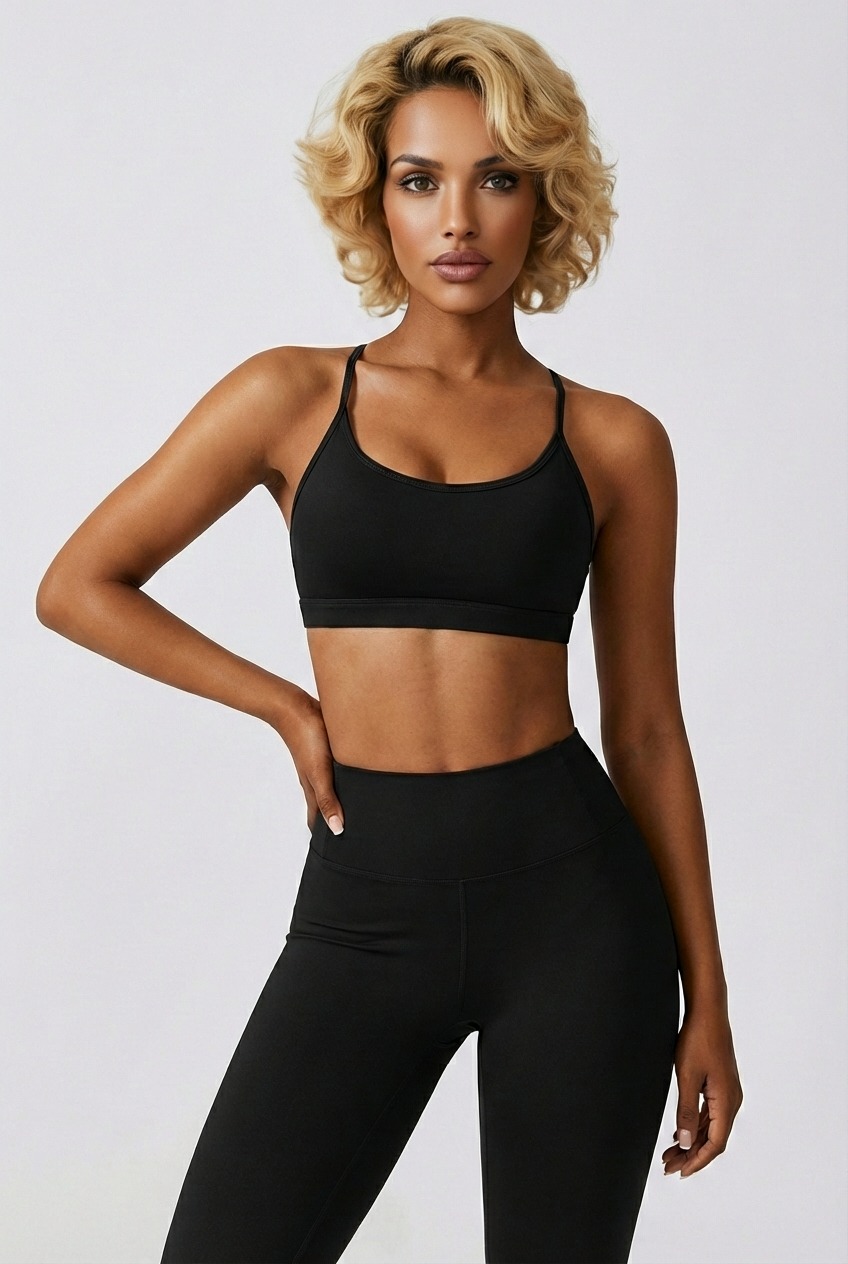 L’ensemble noir iconique qui transforme chaque entraînement en défilé. Brassière à bretelles croisées sculptantes, legging taille haute gainant, design minimaliste absolu. Le noir parfait n’existe pas ? Détrompez-vous. Version bretelles fines ou manches longues selon votre mood.